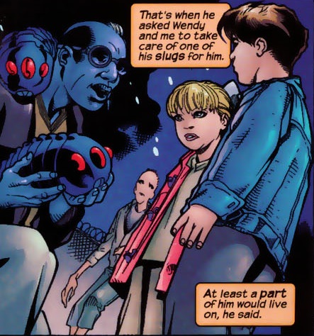 Once upon a time, Maggott “died” in the pages of Weapon X, when he was sent off to the Neverland Ranch. We never saw him die, but it was definitely implied. Before Maggott died, he left one of his slugs with a kid he’d met.