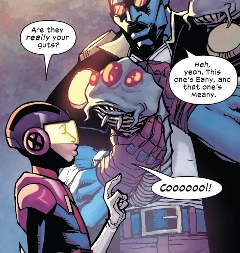 As many of you comic book fans know, Maggott is one of the coolest X-Men ever. It’s a simple matter of facts. He’s one of my favorites, and a new milestone was reached this week in Children of the Atom #1! Granted, it may not have been reached this week…but this is the week I first noticed. Maggott has finally been reunited with both of his slugs! Eany and Meany are back, baby!