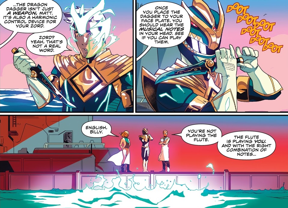 This issue jumps back in time so that we can see Matt Cook’s time as the Green Ranger from his perspective. We see how Grace recruited him and talked him into it, how he was scared to death during his fight with Lord Zedd, and how she gave him a solid pep talk afterwards. We see him meet the Dragonzord for the first time, a moment that Billy was on hand for to help out. We get a small scene between Matt and Kimberly, and one where his parents ask why he quit the football team.