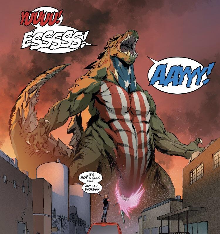 The list should stop here and we should all be happy. American Kaiju is such a silly and yet fun idea. Created only a couple years ago for some fun Avengers comics, he is Army Corporal Todd Ziller (yup) who was given powers through a cocktail of Super Soldier Serum, Pym Particles, the Lizard formula and more! This turned him into a giant lizard monster, then someone painted the American flag on his chest. That’s pure comics and I love it.