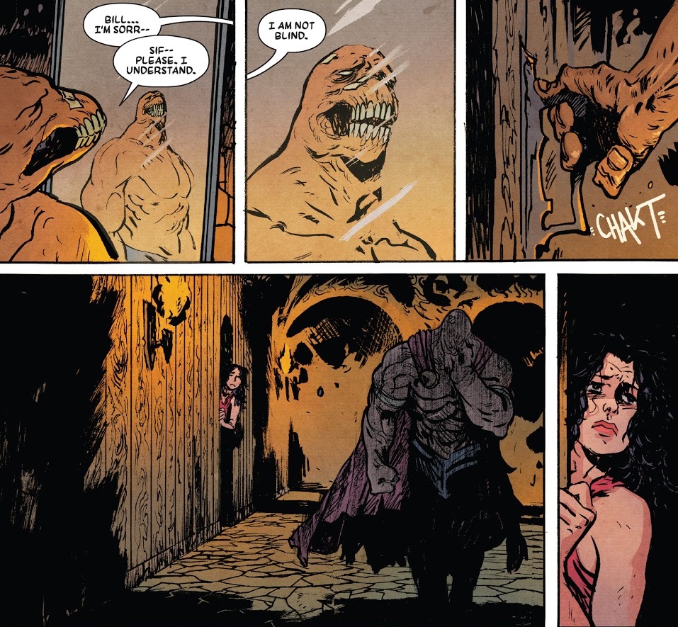 It seems a little out of character for Bill’s look to be a deal-breaker for Sif in the bedroom…but it had to happen for the story, and it works. I’ve always really liked the Bill/Sif romance. She’s always positioned as a possible love interest for Thor, but that story is never going to happen. It makes perfect sense for Sif to instead find somebody else to love, and Bill is awesome. I hope Johnson has more plans for those two in this mini-series, they are a great couple. But the focus is on Bill and it’s great! You really feel the conflicting emotions inside the character this issue, you really get into Bill’s head. I loved it. And Johnson does the artwork himself, giving the whole thing this ink-heavy, powerful and also heart-breaking look.