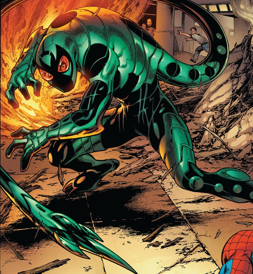 Scorpion is a longtime Spider-Man villains, and one of my favorites, because scorpions were my favorite bug when I was a kid (still are!). He started out in a normal super-villain suit, but most modern Scorpions put him in a big suit of armor! And Ultimate Scorpion was armored. He just looks bigger, cooler and more dangerous in a giant green suit of armor.