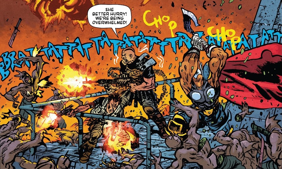 The magics of Muspelheim have transformed Skuttlebutt into a robo-lady, though she’s also still the ship. It’s weird for everybody. They’re soon attacked by the chaotic denizens of this land, and Pip and Skurge man the guns! It’s a brutal fight, and they’re forced to dive down into a lava river to get away. Skuttlebutt manages to use the magic to transform the spaceship into an actual ship to ride the lava.