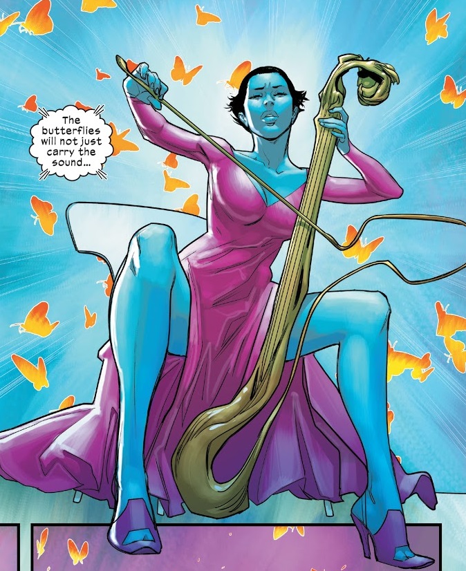 Rhapsody is Rachel Argosy, a mutant with the power to do some weird psionic things with music. She was a high school music teacher who was accused of killing an anti-mutant bigot in town. Multiple Man and Quicksilver investigated and she and Madrox had a little thing — before it was revealing that she unintentionally killed the bigot with her powers. She’d tried to use them to change his mind, but his heart couldn’t take it and he died of a heart attack.
