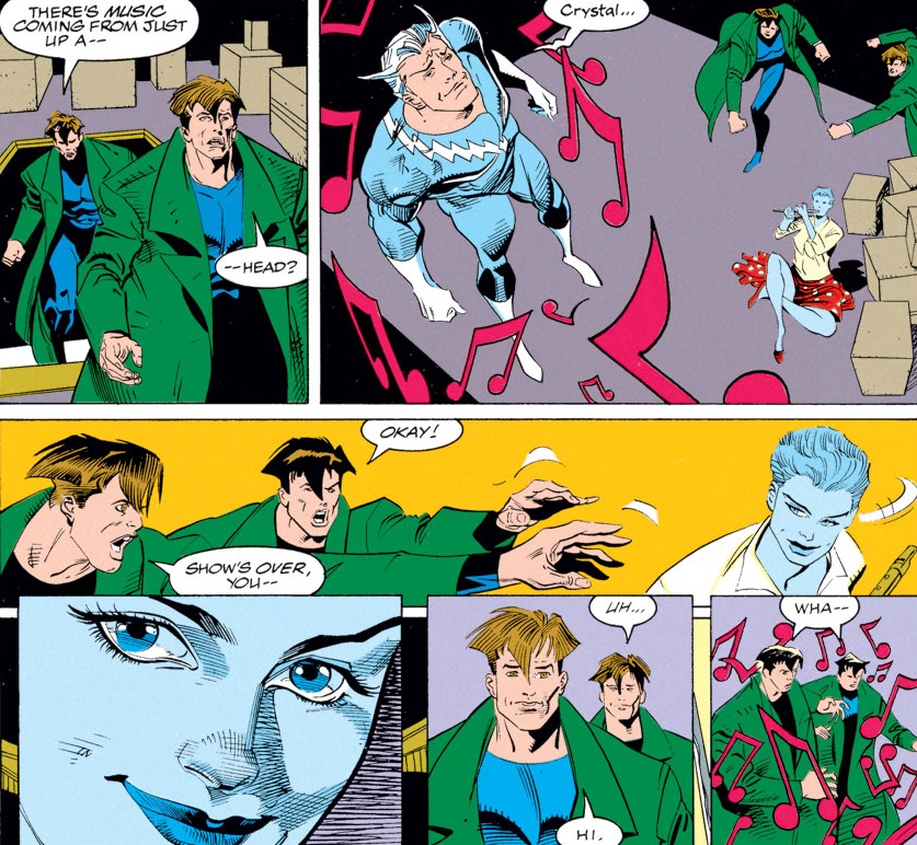 Rhapsody is Rachel Argosy, a mutant with the power to do some weird psionic things with music. She was a high school music teacher who was accused of killing an anti-mutant bigot in town. Multiple Man and Quicksilver investigated and she and Madrox had a little thing — before it was revealing that she unintentionally killed the bigot with her powers. She’d tried to use them to change his mind, but his heart couldn’t take it and he died of a heart attack.