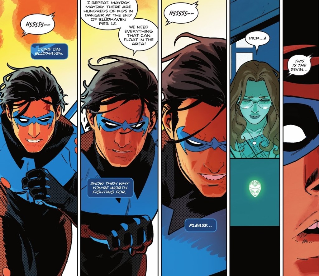 So Nightwing connects to the maritime distress frequency and calls in help from average citizens to get those kids off the pier. Bludhaven’s nautical residents respond to the mayday and send boats to help, filling everybody with some hope. Then Nightwing passes out from his concussion. When he comes to, Tim and Babs tell him to get some sleep, while revealing Melinda Zucco’s identity. Obviously, Nightwing doesn’t listen and he sneaks out to investigate Melinda’s apartment.
