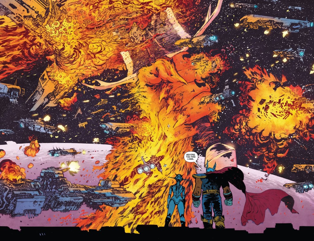 Bill heads outside and stands before his goal: Surtur’s sword, Twilight. Skuttlebutt tries to insist to Bill that he’s a good person on the inside and has never needed a hammer or sword to prove it, but Bill says he’s never felt that way himself. He reaches for the sword…and it smacked away by Surtur! The fire demon has been waiting a long time for a worthy adversary, and Beta Ray Bill will do!