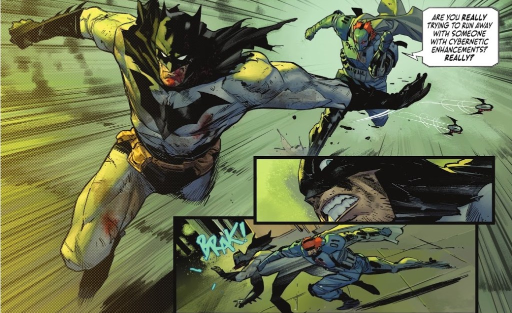 The energy and excitement are unstoppable in this issue. Whereas Detective Comics went a little off the rails for my tastes in its previous issue, Batman is still awesome. The fight with Peacekeeper-01 is great. He’s a really compelling villain and his putting Batman in his place makes sense. That leads to a really cool rescue by Ghost-Maker, which is always fun. I’ll never be convinced that Ghost-Maker is a better ally to Batman than a good Robin, but I’ve got to work with what we are given. It’s a cool scene and propels the story forward nicely. Batman is up against a really powerful force here, and it shows.