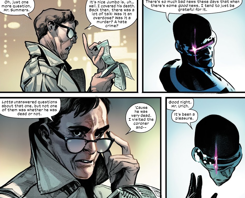 Now, if you’ll permit me, a paragraph of minor nitpicks: the side villains were introduced rather inelegantly. The issue opens with Feilong’s backstory spoonfed to the audience, and then he disappears for the rest of the issue. I have no idea what Dr. Stasis was even doing, and I thought, at first, that it was Feilong returned. Nope. And then, does the rest of the world not know about mutant resurrection? Are they keeping that a secret on Krakoa? Because I’ve done my best to keep up to speed and I don’t think it’s ever been mentioned. And if it has, it definitely hasn’t been a big deal. I’m fine with it being a secret, but if so, why do both Ben Urich and Dr. Stasis focus in on Jumbo Carnation of all people? Ben is talking directly to Cyclops, a man who has died and come back multiple times, including very recently ahead of Krakoa. Did Ben not take that into account? And why does Cyclops skidaddle so quickly when Ben brings up Jumob’s resurrection? Again, you’ve been resurrected multiple times, Cyclops, it shouldn’t be that hard to come up with a quick lie to tell the reporter. Considering how many dead mutants they’re bringing back, Krakoa should have had a “company line” about the resurrections prepared far in advance if they were going to keep the enterprise as a whole a secret.