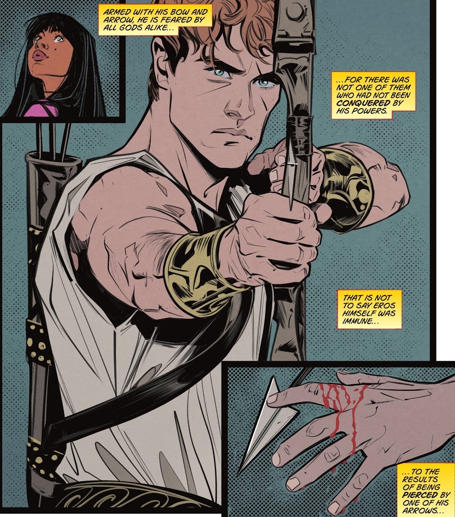 Meanwhile, the Amazons of Bana-Mighdall have sent assassins to kill Yara, and they show up on the plane. Yara has powers now so she fights them off, only to cause a hole in the side of the plane. The plane is saved by Hera, who sent Eros and the West Wind to save them. Eros (otherwise known as Cupid) lines up a shot to take out Yara, only to somehow cut himself on his arrowhead? Like an idiot? And since it’s one of Cupid’s arrows, he falls immediately in love with Yara.