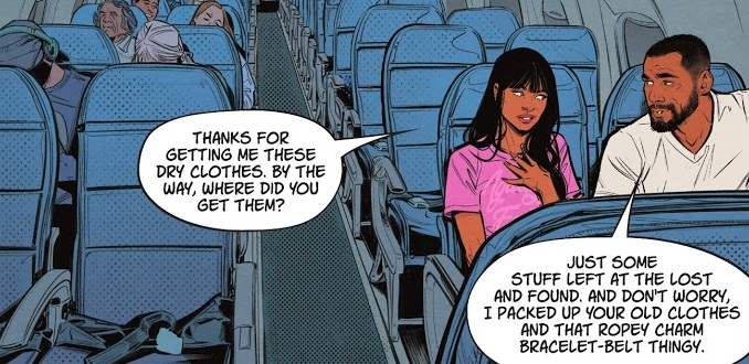 At the end of last issue, Yara Flor fell into a river while on a tourist trip and she was saved by a mermaid. The mermaid gives Yara her bolo weapon while the narration reveals the mermaid’s backstory, and the fact that she is Yara’s namesake. And then she’s gone and Yara flies out of the river. The handsome tour bus driver, João, stays behind to help get her back to her hotel, which involves buying her a plane ticket and flying with her. The guy is really going above and beyond to take his shot, apparently.