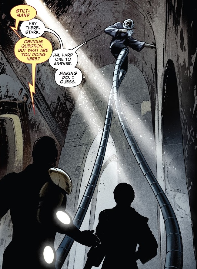 So, uh, I’m not sure of a nice way to say this…but I feel like Cantwell has really let his story get away from him. This was a story about Iron Man and a ragtag team of heroes racing into space to chase down a big bad guy. But this is the third issue in a row that focuses on a tangent. We haven’t had an actual story-based issue since Iron Man #7 in March, which is when Tony was teleported away. Issue #8 was a trip down memory lane for Hellcat. Issue #9 was a side story for Korvac. And now issue #10 is Tony doing something completely unrelated to the previous story. What’s up with that? How does Tony teaming up with Old Man Stilt-Man on a random alien planet to fight Ultimos connect to anything that came before?