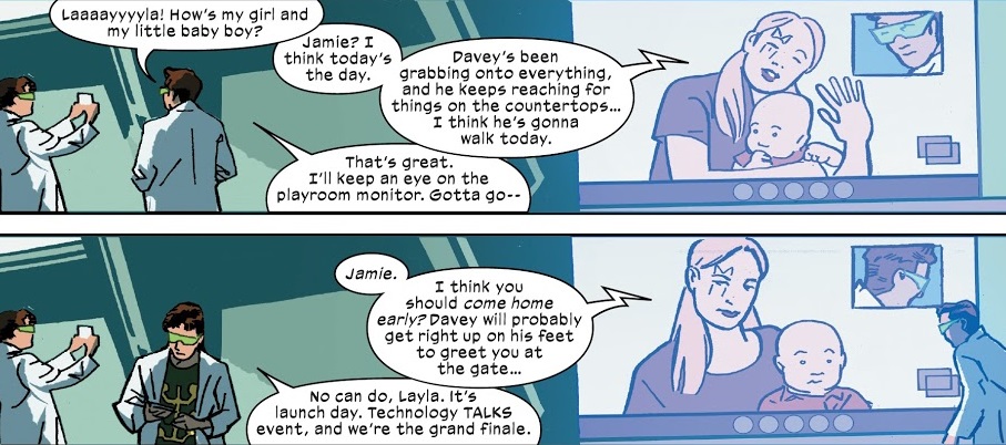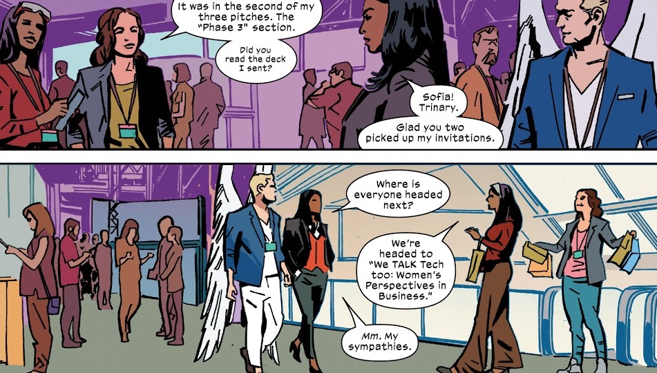 I am very torn on the art. On the one hand, De Lando does an amazing job making everything look grounded and real. These look like real people wandering around a tech conference. On the other hand, the art also looks really ugly and rushed. As if Marvel didn’t give De Lando enough time to draw everything.
