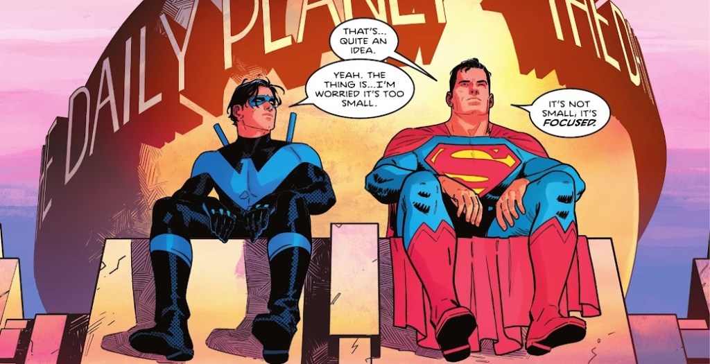 But that’s thinking too far ahead. This issue itself is really fun, and the big moment where Dick announces everything is great. Taylor really digs in deep with the pure joy of the Bat-Family and Dick Grayson’s world, and that stuff is like crack to me. The scene where Dick consults Superman on his plans is beautiful. Who doesn’t like a good Nightwing/Superman scene? Those two are always great together.