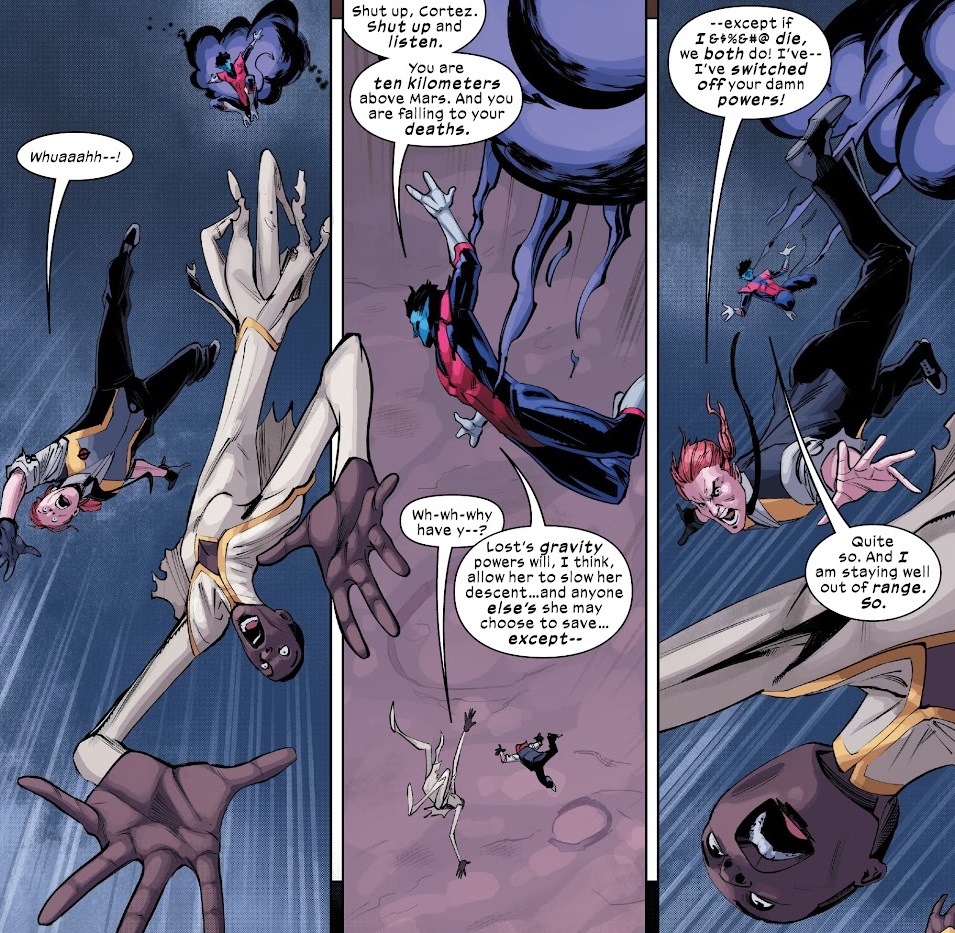 After the Xorns wiped out the bar to stop Onslaught’s attack last issue, Professor X and the others are resurrected and Xavier goes to confront Legion — who is on Mars trying to do something secret, while also trying to talk to Kurt about how Legion has been looking at things all wrong. Kurt, meanwhile, is trying to force Fabian Cortez and Lost to make amends, but they just want to fight each other. As the pressure keeps mounting, Kurt teleports himself, Fabian and Lost to low orbit and they all start falling. Kurt wants Fabian to boost Lost’s gravitational powers and save them all, because teamwork makes the dream work. Instead, Onslaught invades Fabian’s mind and causes him to overpower Lost, killing her.