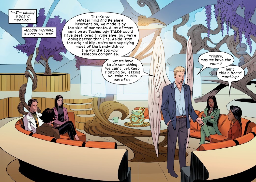 The public launch of the Ionospheric Bandwidth Generator is a disaster…or it would be, if Mastermind didn’t show up and make it look like a huge success. While he puts on a show, everybody else figures out that Kol and Noblesse sent some goons into the HQ to stop the launch. Selene also showed up to help, and she managed to stop Kol’s plan from coming to fruition, and she saved Monet. X-Corp hold a board meeting to discuss what to do about Kol and Monet and Selene propose buying his company out from under him, by pressuring the lower board members to sell their shares. Warren is the only one opposed, though Monet and Selene reveal they already did it that morning.