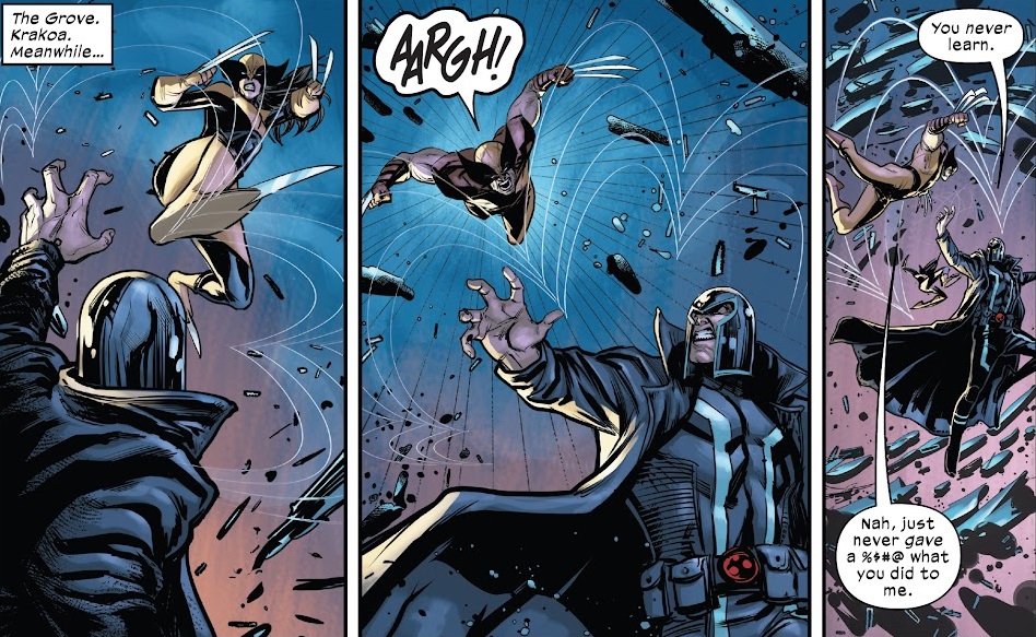 X-Factor investigates the murder of the Scarlet Witch following the Hellfire Gala, with a couple pages of deeply scientific forensic investigation. They come to the conclusion that someone with magnetic powers killed her. Meanwhile, Magneto is causing a big fuss at the Quiet Council as everybody outvotes him to not resurrect Wanda. Magneto storms out and is stopped by X-Factor, X-Force and the X-Men, leading to a big fight. Magneto is eventually brought down by an outraged Quicksilver.