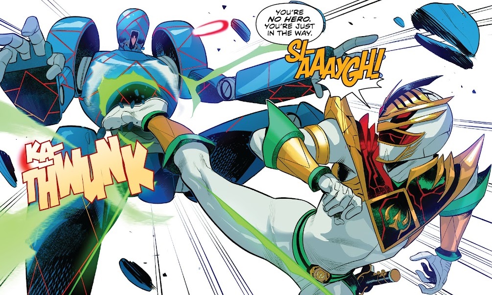 It’s just a cool moment. I didn’t know what to expect from Drakkon in this series, so to suddenly have it all come together with him being super evil — and getting to morph again — was a hoot! I don’t consider him the breakout character of BOOM!’s Power Rangers comics, but that’s probably just me. I simply don’t care for him. But he works as an antagonist, and I like that he wasn’t redeemed by the Omega Rangers. He’s evil, and now he’s got power again, and things aren’t looking good for our heroes! That all works splendidly for me.