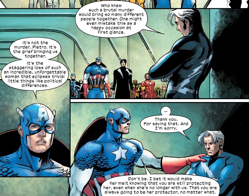 This issue itself was really fun. The smaller, character-based moments gave way to another big fight as Magneto took on both the X-Men and Avengers this time. This felt more exciting in the last issue, but was still rather fun here. The scene definitely worked. But mostly this series is getting by greatly on the character-based stuff. Magneto breaking down and admitting he killed Scarlet Witch definitely feels fishy. I am dying to know all the secrets already!