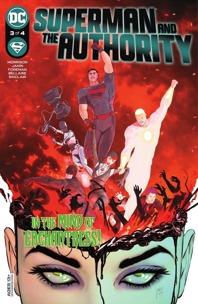 Our heroes fight some demonic mind entities to rescue June Moon from her own psychosis, then invite her to the team as they discuss recruiting their final member: Lightray. Enchantress and Apollo go to get Lightray, but first she’s kidnapped by Eclipso. Manchester Black, Natasha and Midnighter go to Dubai to fight some robots, bicker amongst themselves on the team name and field leadership, and then get ambushed by another group calling themselves the “Authority”. And back at Fort Superman, the Man of Steel is ambushed by the Ultra Humanity in Solomon Grundy’s body. He beats up Superman and prepares to take him to the Bottled City of Kandor to finally swap his brain into Superman’s body.