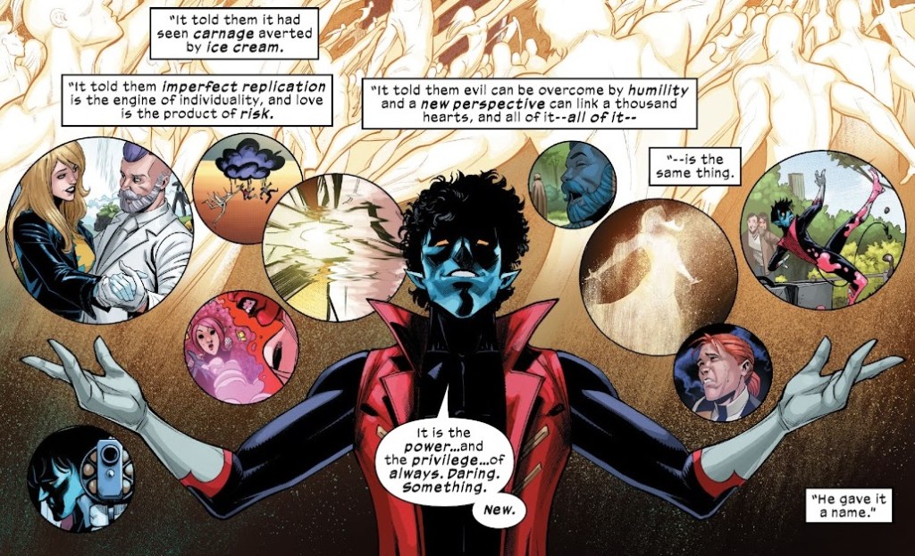 In the wake of this victory, Legion has made his mind palace a permanent place where mutants can come and be safe and worship. Kurt has also settled on his idea: the Spark. It’s not a religion, just a way of living in concert with one another, mutants for mutants. And Kurt is going to put together a new team to support the Spark: the Legionaires.