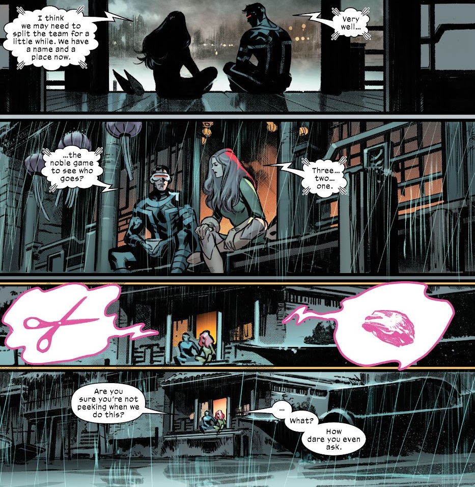 It’s the small character stuff that really elevates this issue. Like Synch agreeing to give up a drop of his blood to end the fight, and then Cyclops assuring him he did the right thing, and that dealing with the High Evolutionary’s follow-up attacks is all just part of the game. I also really loved a scene where Jean and Scott play psychic rock/paper/scissors to decide what to do next about their various foes. It was really cute. And small character stuff like that is what’s going to carry this series, especially when coupled to the big superhero stuff. So X-Men is handling that balance really well. But sometimes the generic fighting can weigh a bit too heavily, is all.