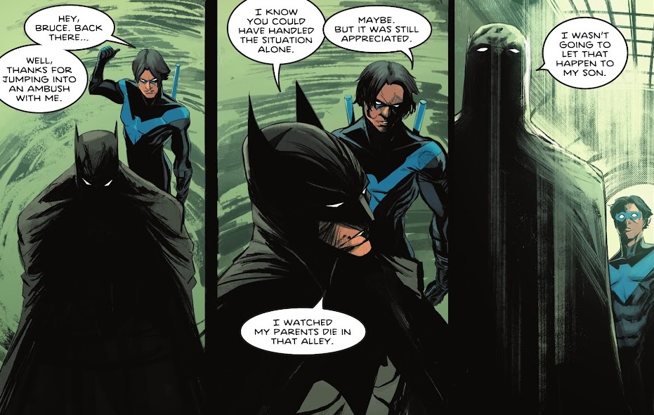 One thing I will always enjoy in comics is some good Bruce/Dick bonding. And that scene where Batman swoops in to help out in a fight is a pure hoot. Taylor really leans into the Dynamic Duo and I loved it! They have a whole action scene together, and then really nice talking scene immediately after. All of that is a surefire way to make me (and probably a lot of people) love a comic. And Taylor writes them wonderfully, just as expected. The guy seems to have been born to write Dick Grayson, and he’s not afraid to team Dick up with all the awesome characters in his life.