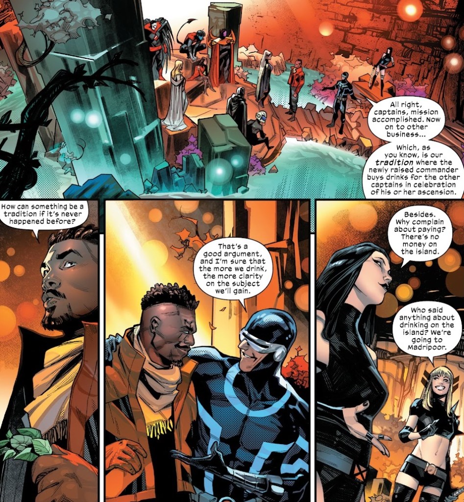 Honestly, it’s just a whole bunch of talking. Like, a bajillion pages of talking. Orchis is getting closer to figuring out mutant stuff. Krakoa is no closer to stopping Orchis. We pay another visit to that time Destiny monologued to Moira in her third life. Charles and Erik visit Moira and talk about stuff. Moira insists Destiny not be brought back to life and convinces Charles and Erik to take steps to make that impossible. Cyclops steps down as Captain Commander, with Bishop getting promoted in his stead. And then Mystique reveals that she has somehow brought Destiny back on her own, and thinks Destiny should join the Quiet Council.