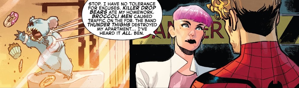 After some training with the Daughters of the Dragon, Ben has chats with his boss, Maxine Danger, and his therapist, Dr. Kafka, looking to settle his mind and confirm his place as Spider-Man. He even gets a visit with his girlfriend back at their security-heavy apartment. But then he’s called into service and finds Morbius hunched over some bodies in an alley. Morbius fights back and bites Spidey on the neck!