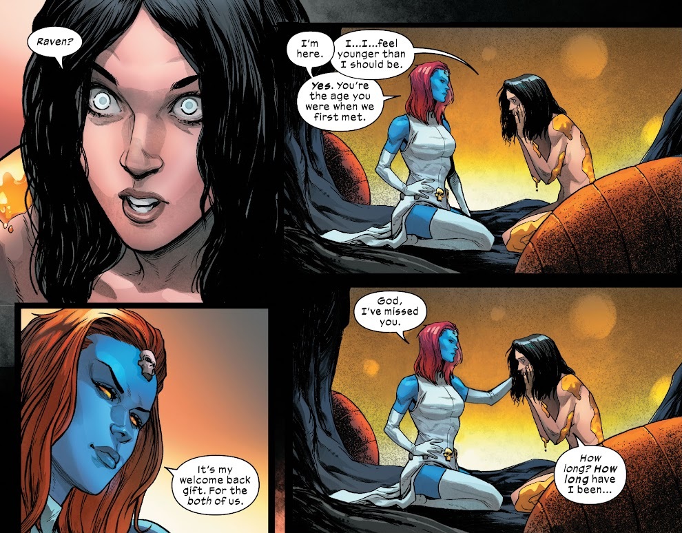This feels like a season finale. Characters are finally having conversations with real weight behind them. Moves are being made, shakes are being shook. And I find it all really fun to read. I live for strong characters and strong interactions, and this issue is dripping with good stuff. I loved every single scene of good X-drama. I loved seeing Mystique work her magic to bring back her wife, and the gentleness of welcoming Destiny back, while also facing what she’s become in the years since Destiny left. I loved seeing Professor X, Magneto and Moira fretting about what needs to be done, and the scene where they bring in Emma is really good. It’s a big move for all characters involved. And then the arrival of Colossus in the end is so weird it’s perfect. I don’t know if there’s some subtext about the choice of Colossus that I don’t understand, but he makes for a great surprise.