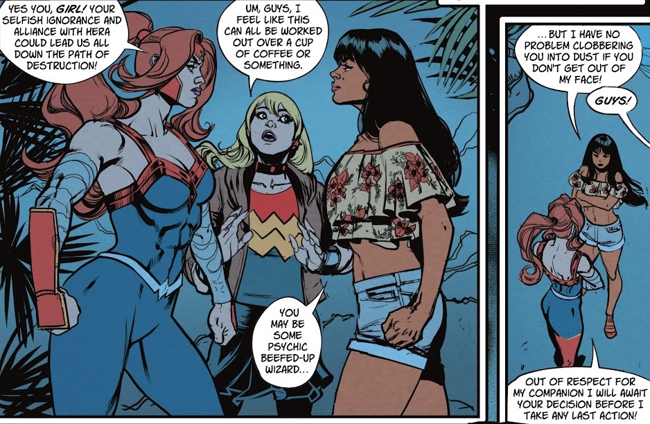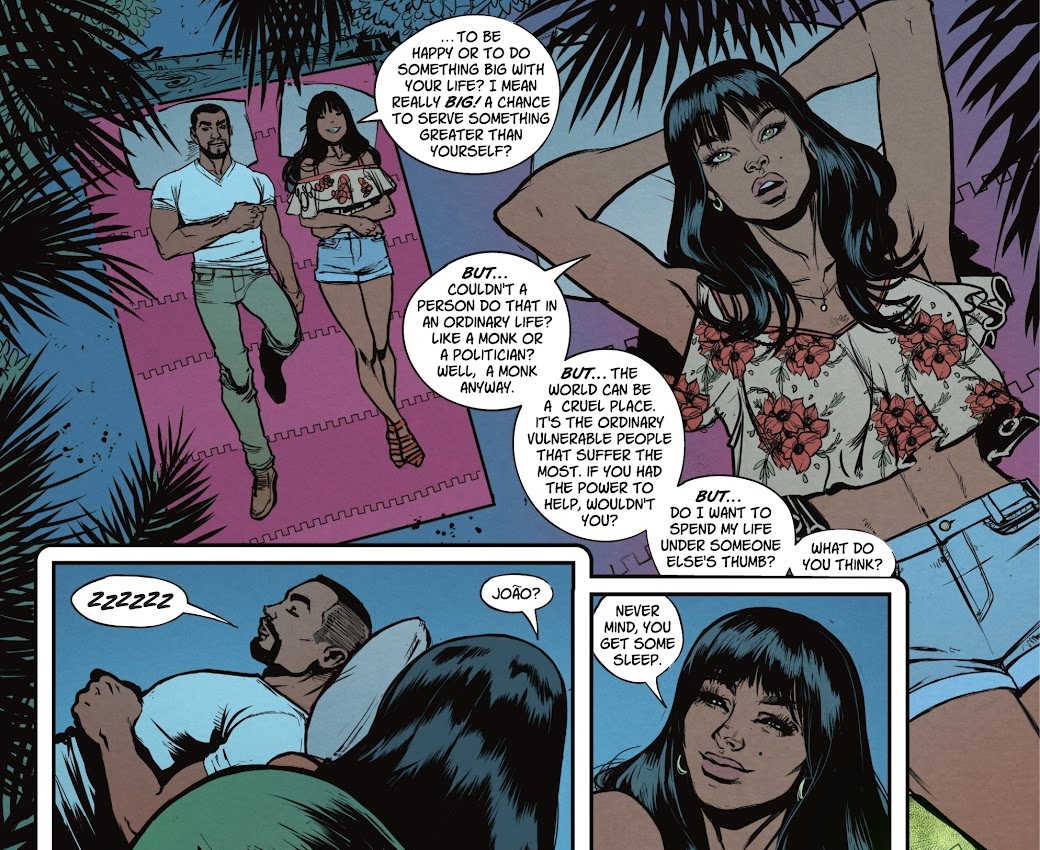 First of all, I don’t think this comic is doing enough to explore Yara Flor as a person or a character. She feels like a passenger in her own story. She’s constantly being pulled along to some new location, never really getting a chance to build a character foundation. She also doesn’t get very many chances to just stop and talk to people. A lot of important parts of character development in this issue are glossed over in montages, from her training on Mount Olympus to her dates with João. When she actually tries to have a meaningful conversation with him, he falls asleep. Then Yara just sits back and lets this spirit give her some back story. And when Artemis and Wonder Girl show up, she just sort of stands there defiantly while the two of them deflate the situation and just leave. I want to actually get to know Yara Flor as a person.