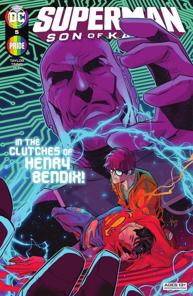Superman has been blasted by a localized solar flare, pushing his powers to the maximum. He can hear everybody in the world. The villain, Bendix, thinks this will hamper Superman, but all it means is that Jon Kent pushes himself to the limit as he races around the entire world saving everyone he can, from a flood in Luxembourg to a lost little girl in Costa Rica to some kidnapped journalists in Zambesi. As he nears the end of his rescue rodeo, Superman begins to get tired, and his new friends come and collect him. The solar flare is wearing off and he used up so much energy that he’s actually tired, because Jon is half-human, after all. He crashes on Jay’s couch.