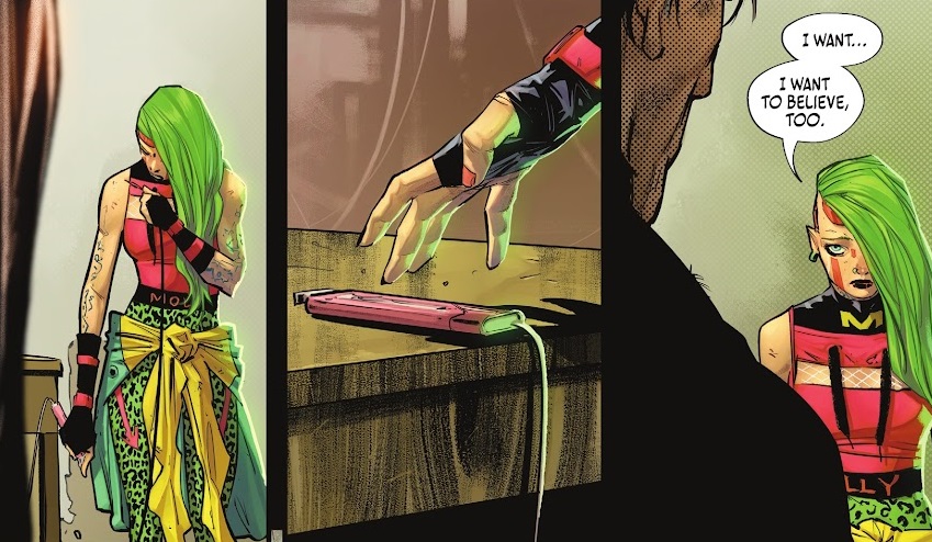 Batman battles Peacekeeper in a truly brutal fight, while Miracle Molly works to disarm the Scarecrow’s fear bomb. Batman gives Peacekeeper a lesson in how selfish he’s always been, and whoops the bad guy’s butt using his own utility belt as added padding on his fist for more epic punches. When Peacekeeper is down, Batman turns to Molly, who reveals that she has rewired the bomb to fulfill the Unsanity Collective’s original goal: erasing people’s trauma. Batman gives Molly access to his cowl feed to see that she doesn’t need to do this.