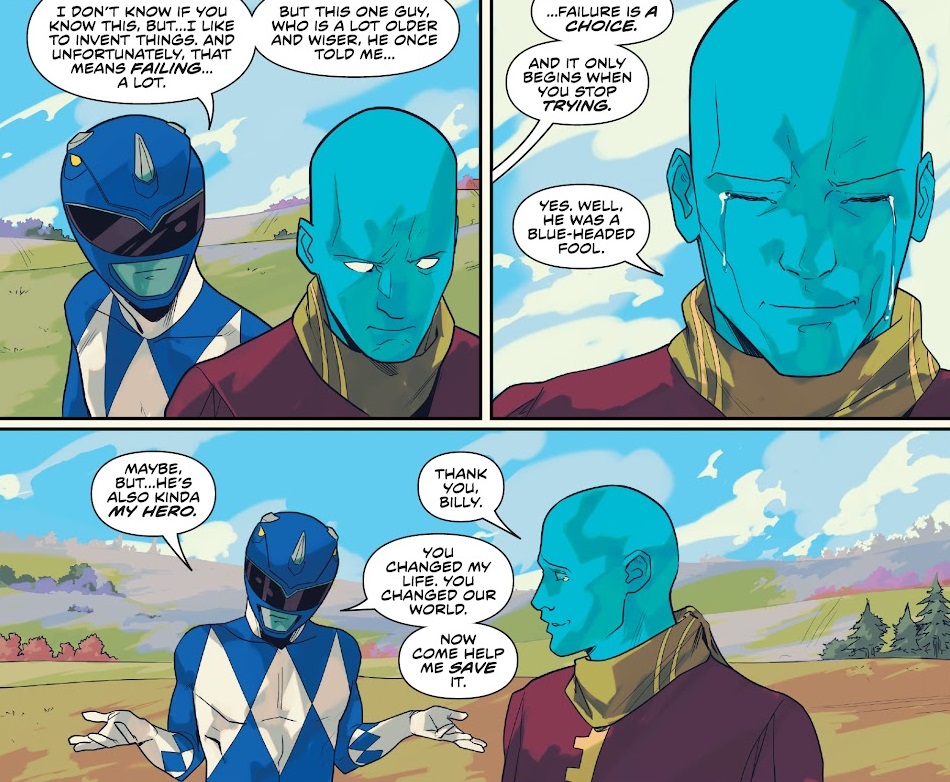 Meanwhile, Billy teams up with Yale and the Blue Emissary to head into Zordon’s sub conscious to try and pull him out. They’re able to insert themselves into Zordon’s memory flashbacks until they can convince him to help, with a stirring pep talk from Billy. Once Zordon is brought back, Billy equips him with a power suit!