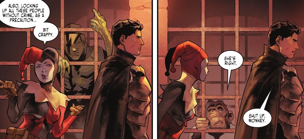 The court of the House of El argues about going to war, with Kal-El quite dismissive of Bruce’s opinion. Kal goes down into the dungeons to interrogate the archer, while Harley Quinn tries to council Bruce about prophecy and war (and we get a fun glimpse of a bunch of DC cameos in the dungeon, including the Flash).
