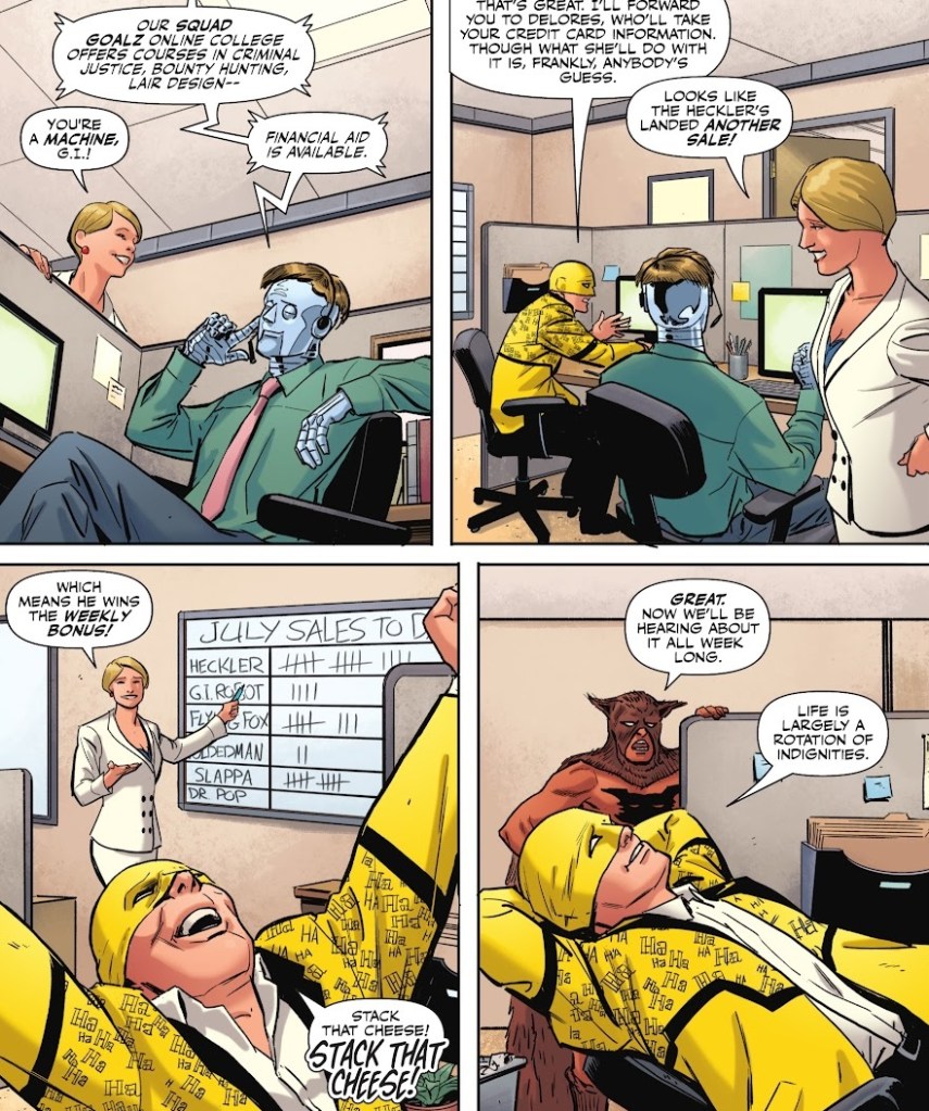 Heroz4u is a business that provides superhero services in the gig economy, employing C and D-list heroes (and below) to give them jobs in telemarketing, online courses, Cameo-style messaging, gig-style appearances and more. The Metropolis branch of Heroz4u is run by Red Tornado, with Power Girl as his second, and guys like Minute Man, The Heckler, Flying Fox and more employed throughout. We get a good look at the business, with Minute Man complaining that he doesn’t get enough to do, Power Girl talking to the others about her business-focus drive after reading Max Lord’s book, and the Heckler being good at telemarketing.