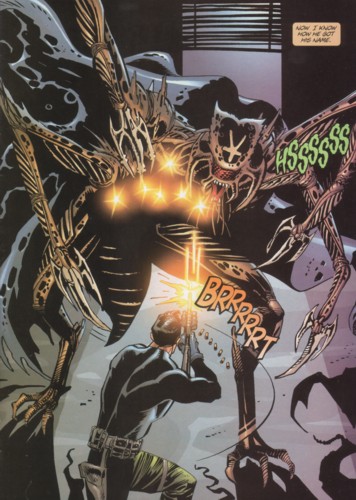 Arachnid is a reoccurring villain for Savage Dragon, that seemingly endless Image Comic that Erik Larson keeps making. He was an early villain, a giant, cannibalistic creature that lived in the sewers and fed upon homeless people — so much so that when Dragon first found him, Arachnid was too big and bloated to put up a fight. Dude just got his butt handed to him and arrested. Arachnid would pop up time and again to combat Dragon, always getting his monstrous butt handed to him. Classic super-villain.