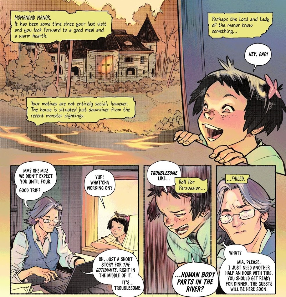 Meanwhile, there’s a back-up feature by creator Karl Kerschl in which Maps Mizoguchi from Gotham Academy dresses up like Robin to investigate the disappearance of a classmate. It’s adorable and super fun. She writes a journal like she’s a hardboiled detective, while also making Dungeons & Dragons references. And she briefly teams up with Batman.