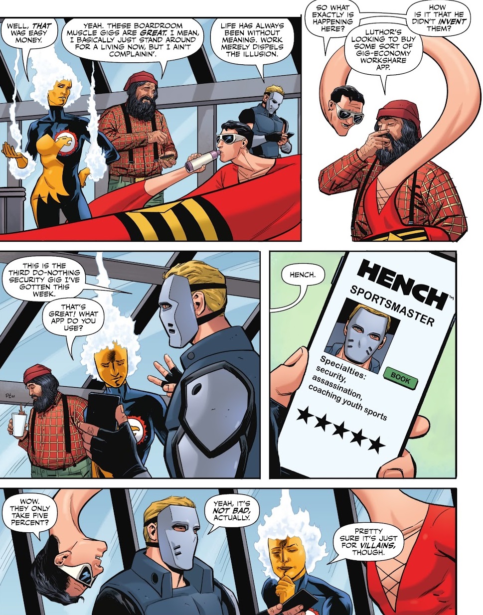 Oy boy, this issue really turns the screws on Minute Man. Sorry to any Minute Man fans out there. His downward spiral is pretty funny, and well-crafted. I love the escalation, and it’s especially sad that Russell doesn’t throw the dude any bones. It’s all misery all the time. But it’s the issue as a whole that continues to sell this whole concept. I love the B-plot where Plastic Man and Firehawk get a plum gig escorting some tech millionaire to a meeting with Lex Luthor, and then the two of them just hang out with Luthor’s own hired goons and shoot the breeze about the ease of costumed gig work. It’s a funny scene.