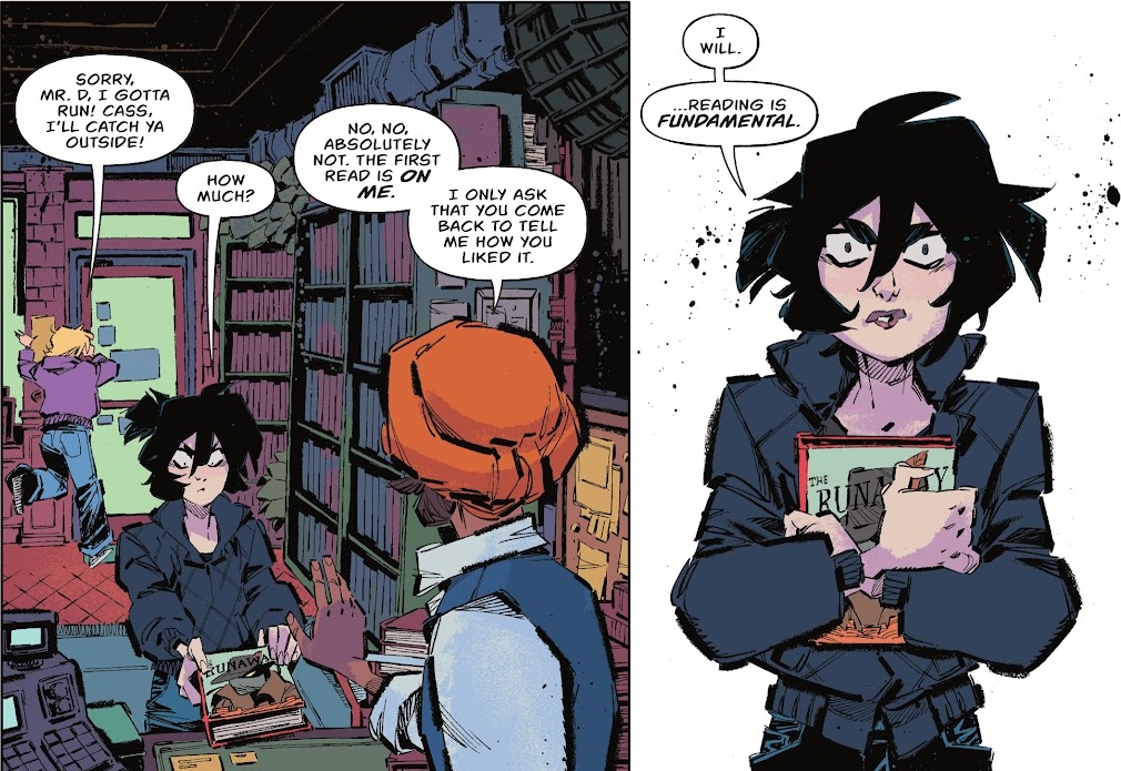 Babs give Steph and Cass the day off and they meet with their local bookshop owner friend, whiles still spying on their mysterious neighbor. Then night falls and they gear up to go after the Tutor, who of course reveals that he knew they were tracking him…though he doesn’t have much of an ambush planned. For the third issue in a row, Stephanie falls victim to his mind control gas and Cass can’t just beat him up. Cass uses the power of friendship to bring Steph back and they defeat the Tutor.