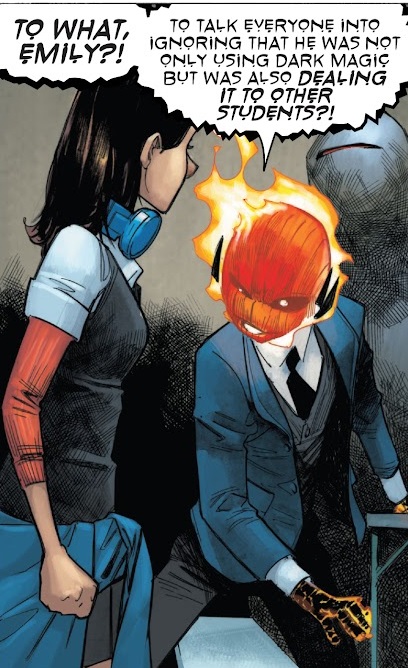 OK, so let me break down how I’m feeling about all of this. I completely agree with Doyle that Calvin deserved to be expelled. As Emily explains, Calvin was just a normal kid who found a magic jacket, and that’s what qualified him for membership at Strange Academy. Then the jacket turns out to be this leftover dark magic monster that Dr. Strange once cast off. The monster goes crazy, the good guys defeat it and, therefore, Calvin loses his magic. It sucks, but it’s nobody’s fault. Emily is eager to blame Strange for allowing this dark magic monster to exist…but I don’t see it that way, at least not to the extent that Emily wants her classmates to.