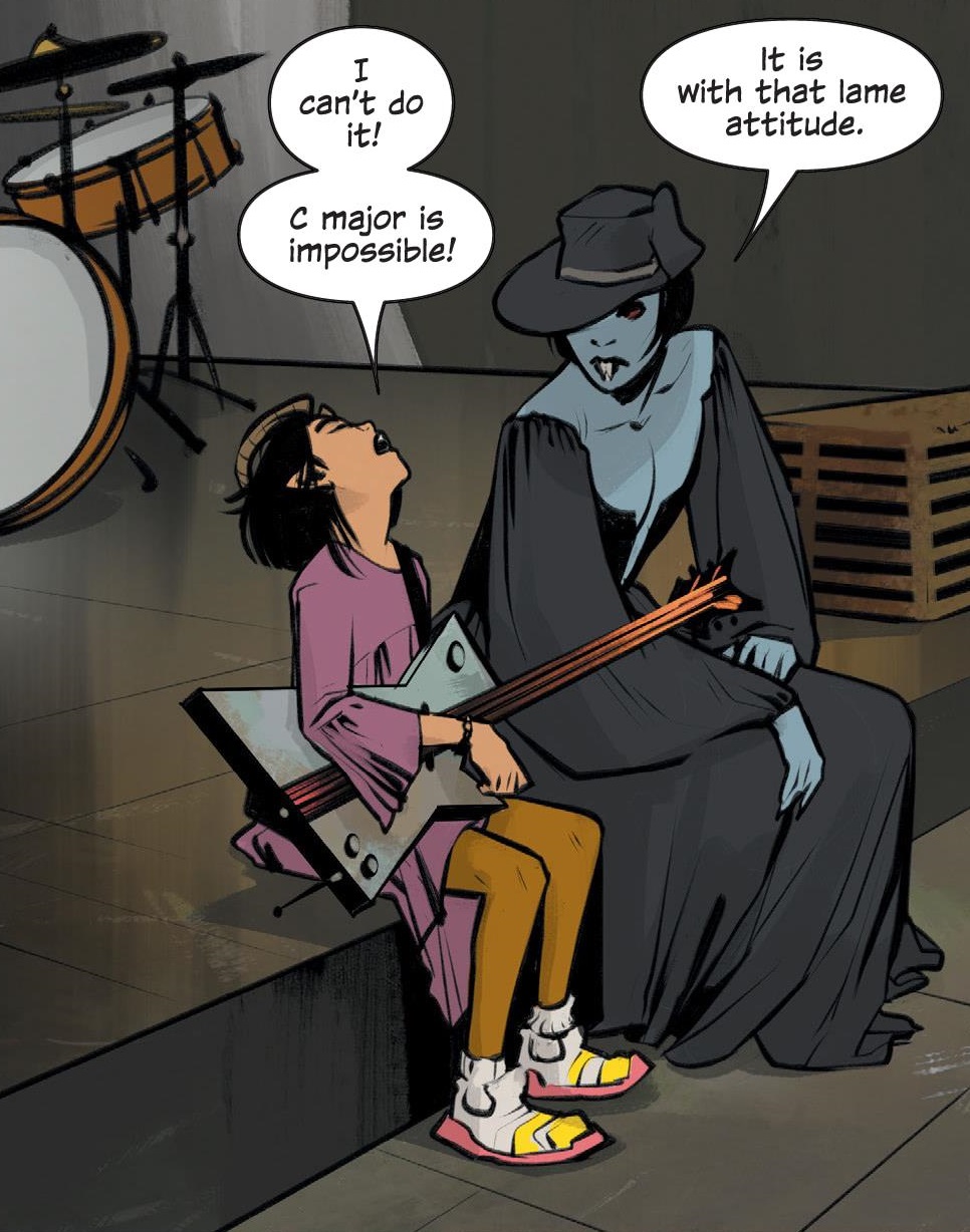 Alana goes off to do the drug deal and meets a dude who also recently lost his spouse, and the two of them bond and commiserate over their losses. Meanwhile, the band teaches Hazel guitar and teaches Squire drums, while Bombazine attempts to impart some fatherly wisdom. But the pirates are onto him, and the Skipper reveals that he knows of Bombazine’s vile past. Skipper promises that they’re on the level, but he is going to need one little favor…