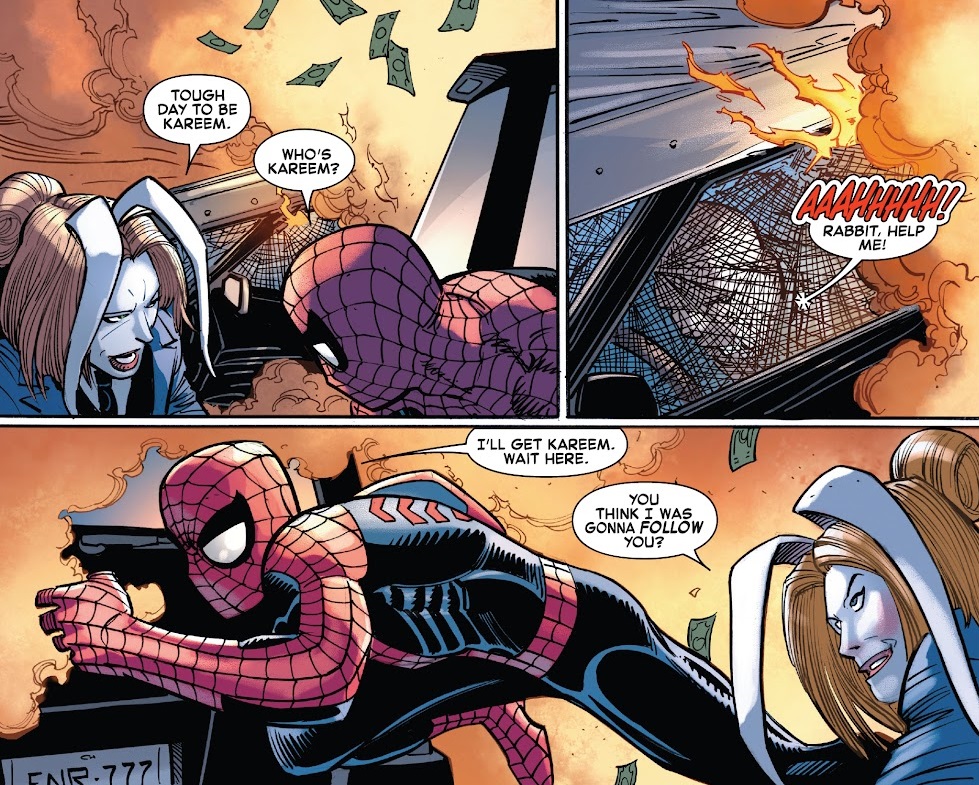 But he’s still Spider-Man, and he inserts himself into a deal between Tombstone and the Rose (with guest appearances by White Rabbit and Digger). The two crime boss villains decide to go to war, and Tombstone has a chat with Peter Parker so that Parker can pass on a message to his pal Spider-Man that Tombstone is going to take a special interest in him. Also, Randy Robertson wants to ask Tombstone’s daughter, Janice Lincoln a.k.a. the Beetle, to marry him. That’s nice.