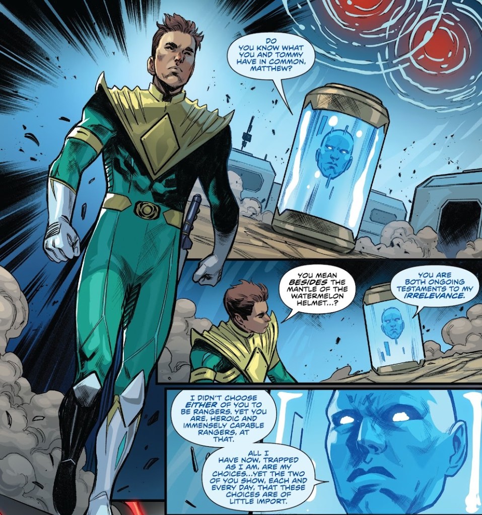 That is just great payoff. Everything we’ve seen with Zordon for years now, coupled with all the history of Matt and Tommy and the role of the Green Ranger, all builds to that great moment. And that’s just the first one! Zordon gets another wonderful moment later in the issue when he tells Rocky it’s more important to save Matt than it is to protect his secret identity, and he says it while locking eyes with Grace. So damn good! And it leads to the heroic appearance of the Red Ranger on the final page. I don’t know if I’ve ever been more excited to see the Red Ranger charge into battle. I hope Groom picks up on some of the subtle Rocky/Red Ranger storytelling that Parrott established.