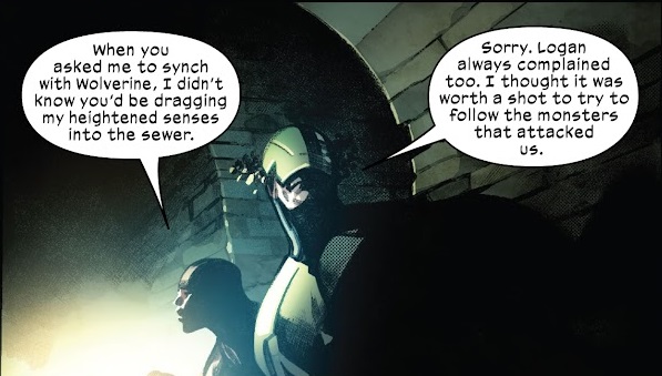 Likewise, I enjoyed the back-up tale of Cyclops and Synch pursuing their other foes through the sewers. Duggan is making really good use of Synch. He gets a really badass moment to put Wolverine’s copied powers to good use. And then Cyclops gets to be a total boss as he destroys Dr. Stasis. It’s particularly funny. Stasis is wearing a helmet, and he brags about how the X-Men can’t touch him when he wears his helmet, because it’s psychic-proof (similar, obviously, to Magneto’s famous helmet). But Cyclops and his powers aren’t stopped by a dumb helmet. The twist that Dr. Stasis is some Mister Sinister clone who doesn’t know Cyclops is an interesting one. Personally, I don’t care for Sinister, and I’m not very thrilled that he’s become such a major player, but I can push that down in favor of the cool fight Cyclops fight scene.