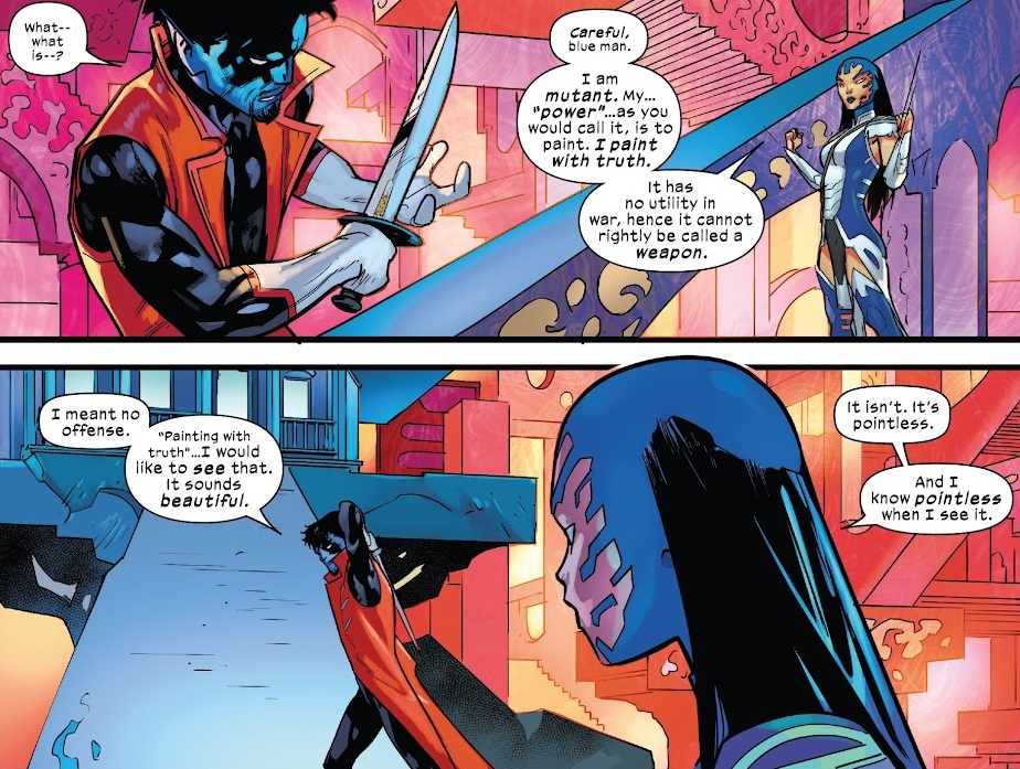 Let me get this out of the way first so that it doesn’t take up the entire review: I don’t like Arakki and nothing in that sphere has ever interested me. This issue is a fine example of everything wrong with that whole concept. The scenes where Nightcrawler is getting up to speed on the Arakki storyline is so mind-boggling asinine and full of weird names, characters, concepts and just about everything else. There’s so little grounding in reality or anything that matters. I legitimately hate it and would stop reading this comic if that’s what it was all about — but I do like Weaponless Zsen and some of the creativity put into her name. I also like the idea of a new love interest for Nightcrawler. So perhaps not all is hopeless.