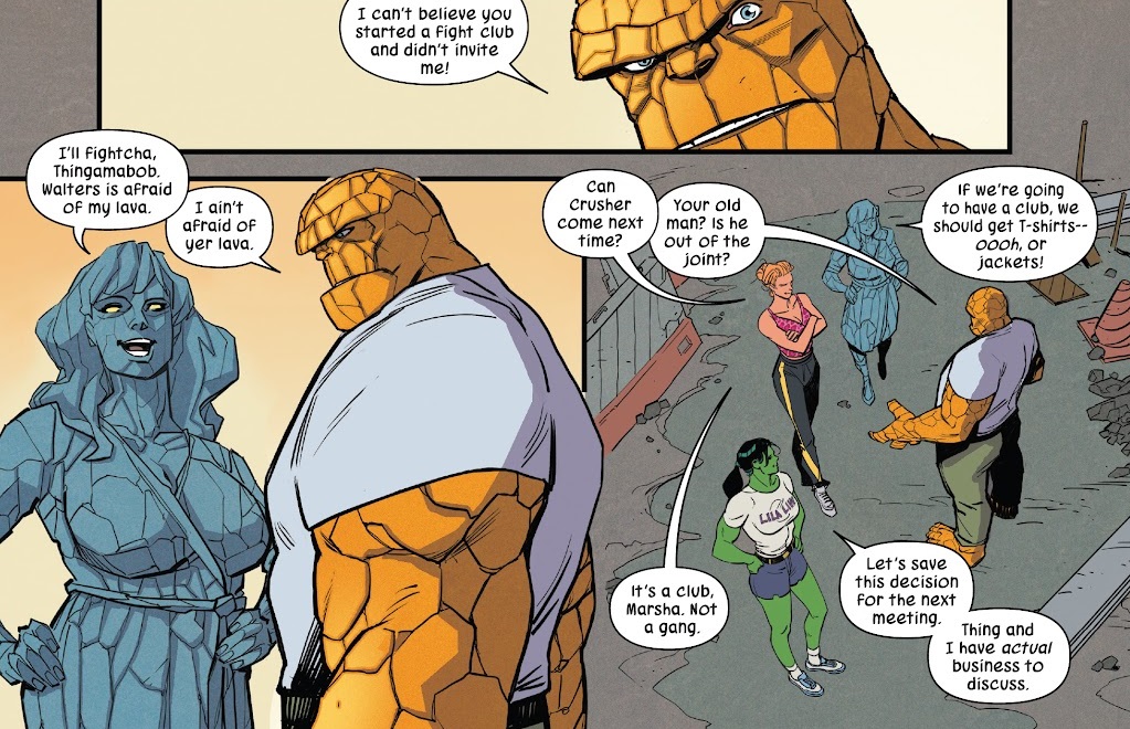 We open with She-Hulk and Titania knocking each out around in their new fight club, with Volcana hanging out nearby and cheering on her friend. The Thing had an appointment with Jen and he shows up in the middle of the fight, then gets a quick explanation. It’s fun. Then Jen and the Thing get lunch as she helps him sort out his ticket. He reveals he sent a bunch of other super-people clients to her office, and she tells this cameo circus that they’ll need to be discreet from now on. Nice moment with Reed Richards, too.