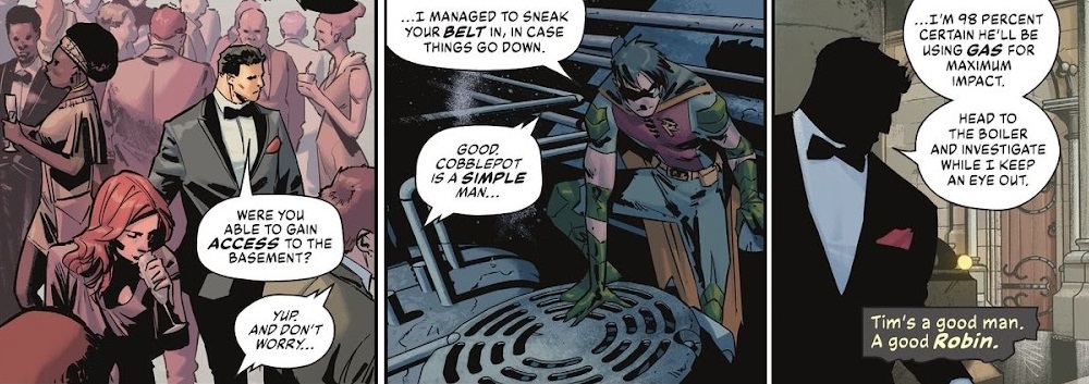 Batman is feeling pretty adrift these days. He still doesn’t have his fortune, and some of the Bat-Family are worried that he’s not spending enough time as Bruce Wayne. Tim Drake, Robin, pays him a visit to discuss just that. But Bruce reveals he’s been invited to a fancy party. The Penguin has started a grassroots campaign to kill the rich people of Gotham, and Batman figures the party will be a great place to ambush him. Bruce goes in as a civilian, while Robin goes in to stop the gas attack that Bruce predicted. Bruce then dons a Batman mask over his suit and confronts the Penguin…only to learn it’s Clayface! In the commotion, Batman convinces Clayface to help people and give up the Penguin, while Tim gets shot by a goon! Batman rushes Tim to the hospital, having to remove the Robin costume ahead of time, remembering back to when he had to do that when Jason died.