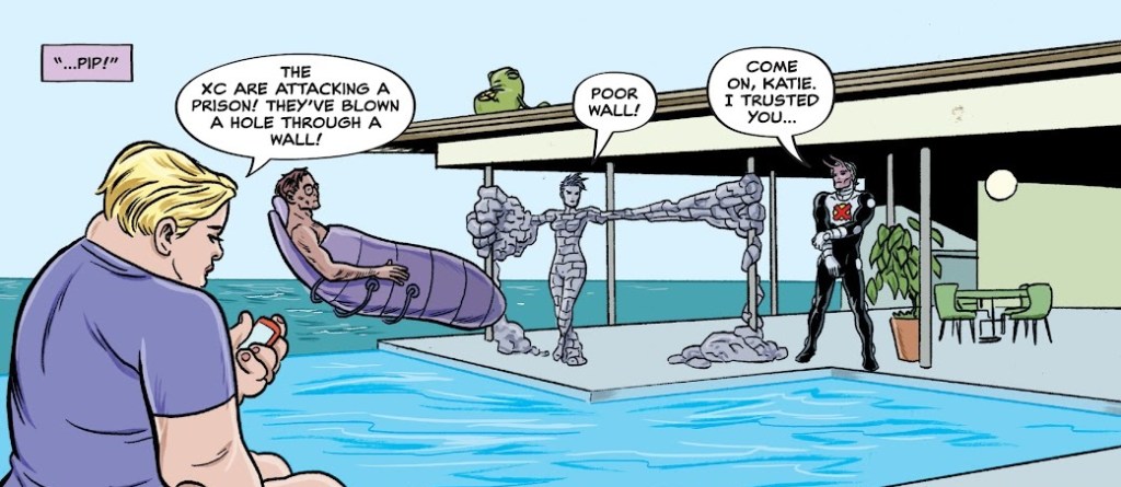 Fluff died after falling from a great height, and his death is being investigated by celebrity blogger and teleporter Toodle Pip. She goes to Mirror Girl to get the scoop on Zeitgeist, but Mirror Girl is as conflicted as ever. Zeitgeist reveals his plan to the rest of the team: once he reaches 500 million followers (or acolytes), he’ll use the Book of Vishanti to turn himself into a living god. To earn some more followers, they head to a prison to break out some popular anti-heroes. X-Statix go to intercept, with Katie and Mike already arguing about their relationship.