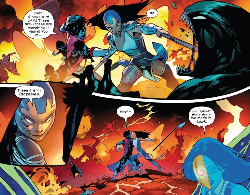 Nightcrawler and Weaponless Zsen head out into the Astral Plane, or some new levels of it, with Blindfold as their guide, to look into the Arakko god of mischief. Everything gets freaky deaky as they explore dreams, desires and fears in a dreamscape. Back on Krakoa, Juggernaut is feeling shook after his encounter with the Skinjumper, and Legion gives him some good advice. Then Juggernaut helps out Pixie when she faces some freaky deaky stuff of her own, while chasing the Skinjumper. They all realize that the Skinjumper is now worshiping the god of mischief, allowing it to get a foothold on Krakoa. Also, the god of mischief has turned Banshee into a flame-headed acolyte.